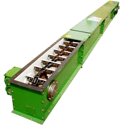 Название этого конвейера говорит само за себя, груз в таком конвейере передвигается с помощью скребков по неподвижному желобу. Скребки соединены с подвижной цепью.